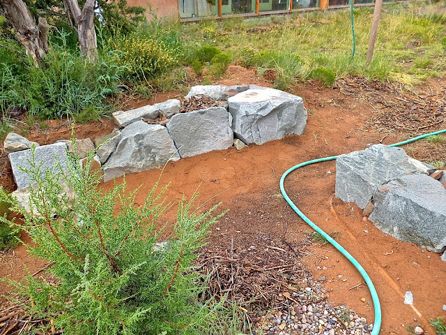 This is basically the "mortar" to keep the stone together and provides a base for the adobe mud mortar that will go down as we start our first course of adobe brick.